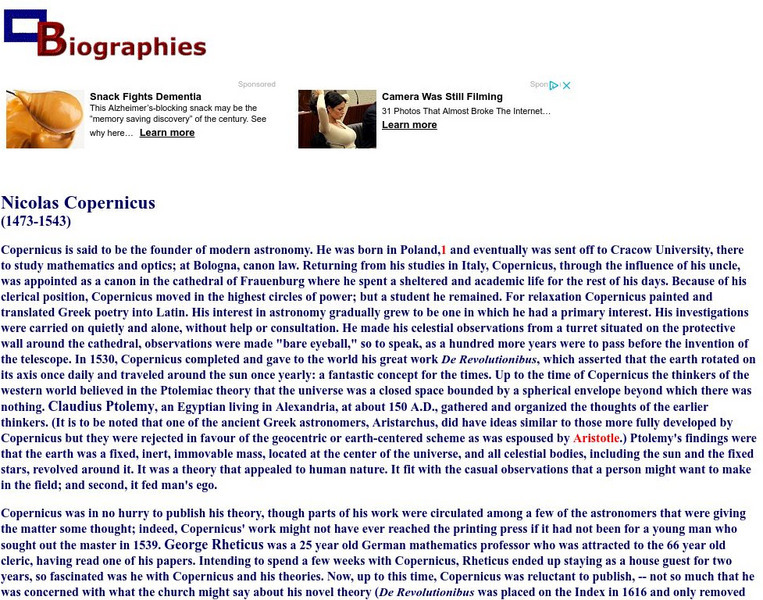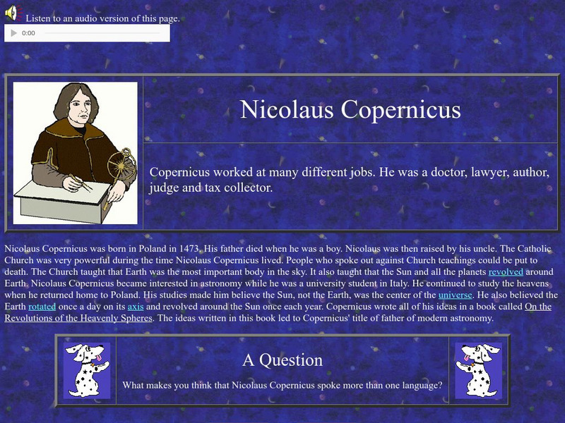 Part of a NASA site for younger children, this site contains a short biography of Copernicus with hyperlinks to terms. Printable version available.