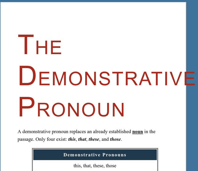 Printable information is provided that demonstrates how to identify a demonstrative pronoun in the context of a sentence.