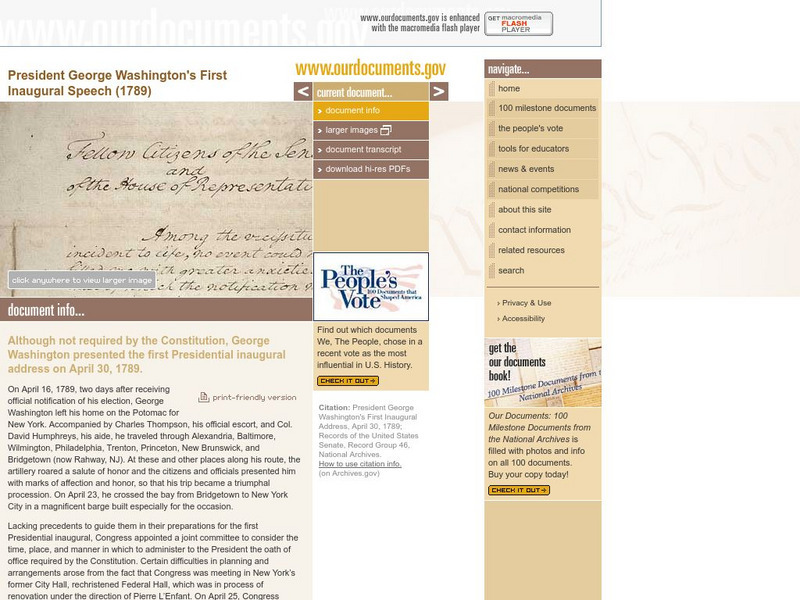 This site presents the full written document of President George Washington's first inaugural speech. Content includes information about the speech, images of the document itself, and a full transcript of the document.