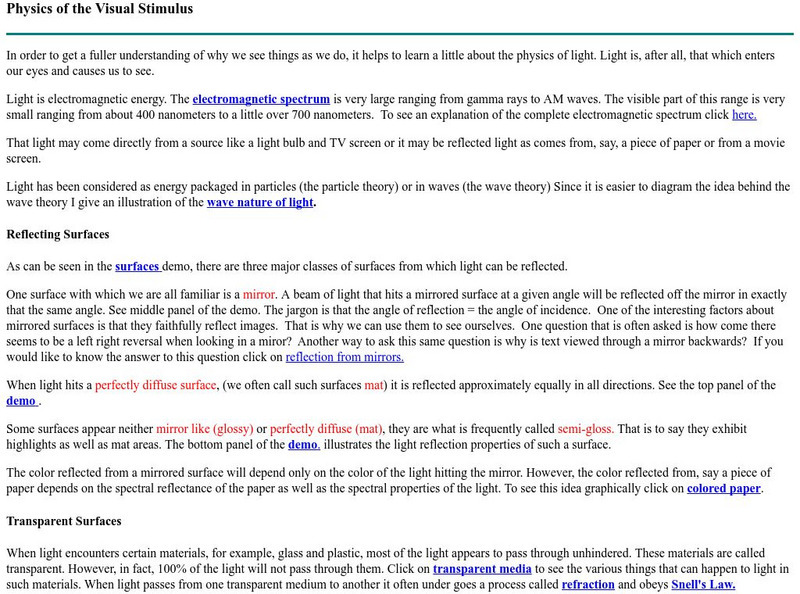 From an online "book," this particular page describes physics principles related to vision and sight. Keywords are linked to other pages with further information. The role of sunglasses in blocking glare is discussed and explained. A...
