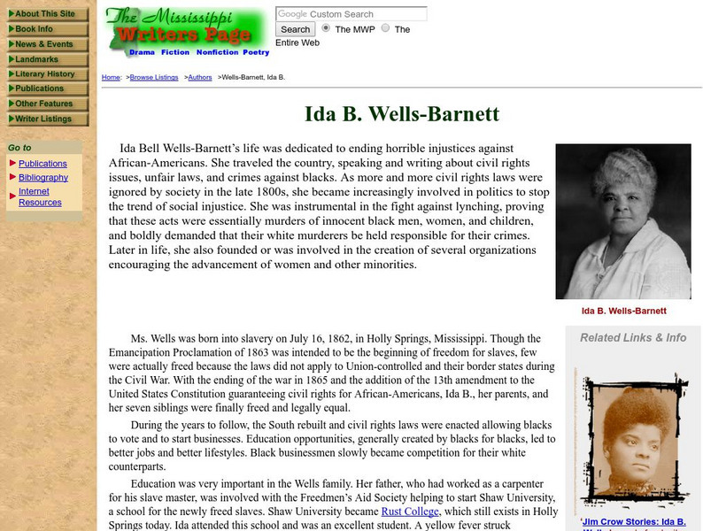 The University of Mississippi offers a detailed biography of Ida B. Wells-Barnett (1862-1931) the famous freedom fighter is offered at this site. It includes an extensive bibliography of her works, and works about her, as well as some...