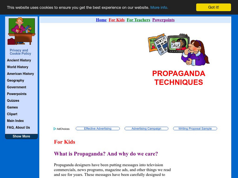 Students complete activities to study the propaganda elements from various war times. In this war propaganda lesson plan, students compare and contrast works of art from various viewpoints about war from varying social periods....
