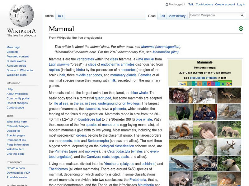 Wikipedia, an open-source encyclopedia, provides great information on mammals. Content includes a look at mammal characteristics, origins, classification, and more.