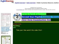In this water worksheet, students watch a video on water, read a passage, complete sentences, write vocabulary words, and write a paragraph. Students complete 5 activities total.