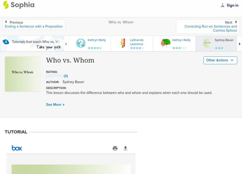 This lesson discusses the difference between who and whom and explains when each one should be used. This tutorial lesson shares a short slideshow with the lesson's content.