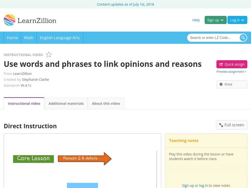 Learn Zillion: Use Words and Phrases to Link Opinions and Reasons