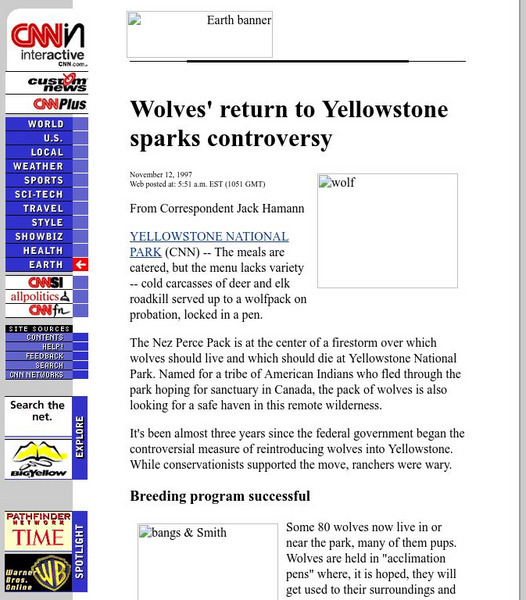 This article, published by CNN (November 12, 1997), marks the return of the wolves to Yellowstone National Park. The article highlights that the change was not popular with everybody.