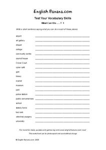 In this English Language vocabulary and writing worksheets, students use the pictures to identify the places vocabulary terms. Students then a sentence for each vocabulary word.