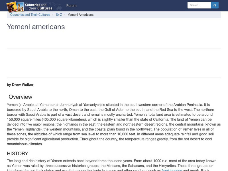 Provides an overview of the history and the traditional culture and lifestyle of Yemeni Americans. (Note: Content is not the most current.)