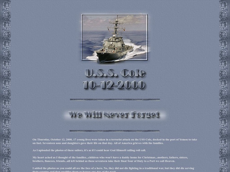 This site is a memorial in remembrance of those who died in the terrorist attack of the USS Cole in October 2000. Content includes the names and pictures of the victims.