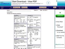 In this basic algebra instructional activity, 8th graders solve and complete 6 different types of algebra problems as described in each box. First, they determine the value of a set of numbers with one pair of positive integers. Then,...