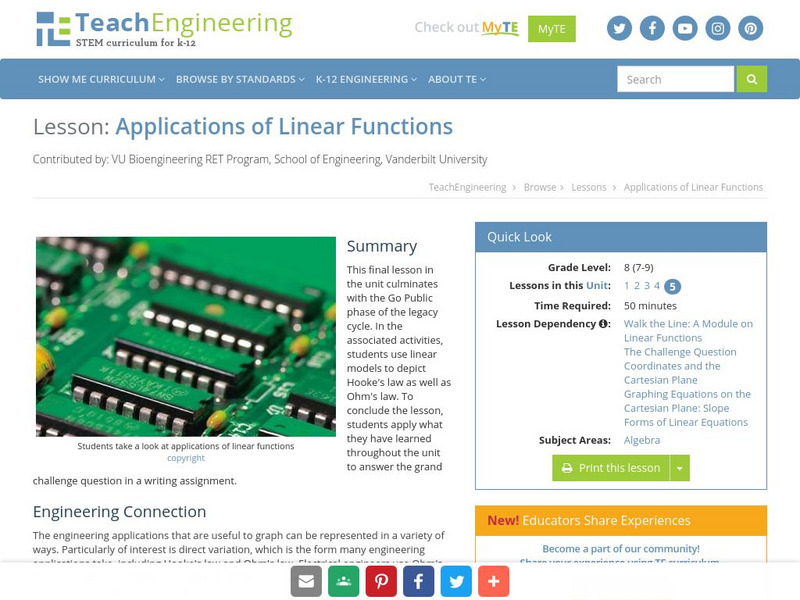 This lesson culminates the unit with the Go Public phase of the legacy cycle. In the associated activities, students use linear models to depict Hooke's law as well as Ohm's law. To conclude the lesson, students apply they've learned...