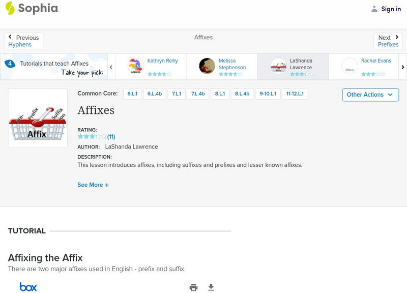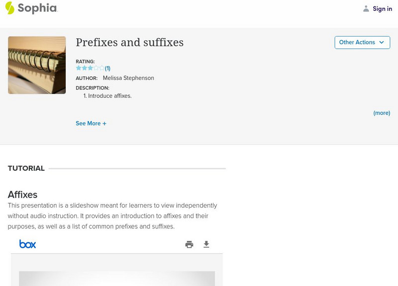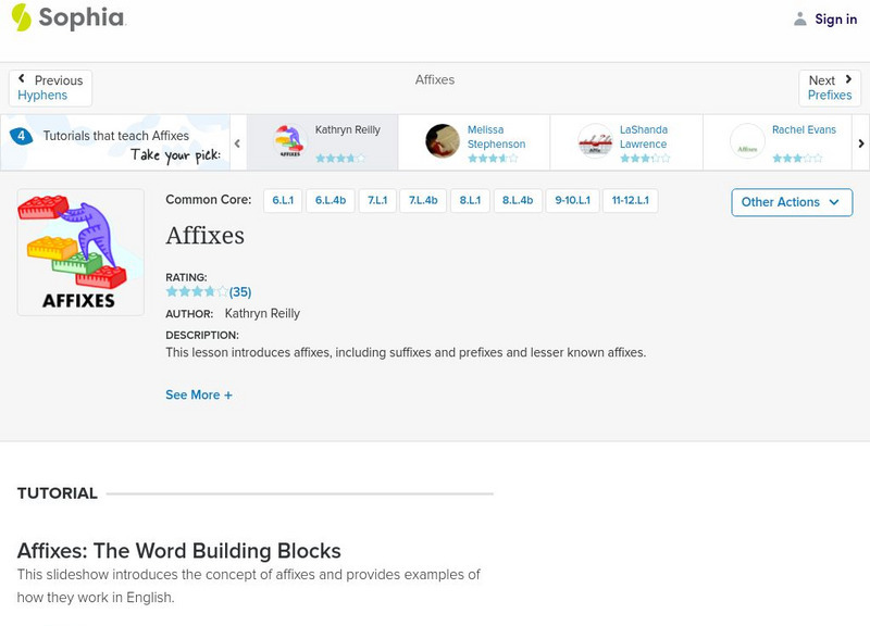 This tutorial focuses on prefixes and suffixes using a slideshow and two videos. The first video discusses affixes including prefixes and suffixes and how they work; it also has an embedded YouTube music video about the power of...