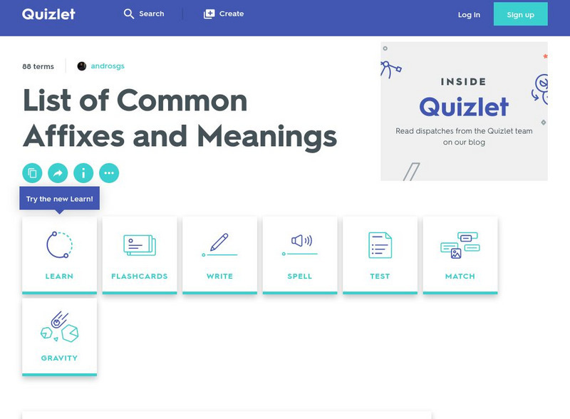 Quizlet: List of Common Affixes and Meanings: Flashcards