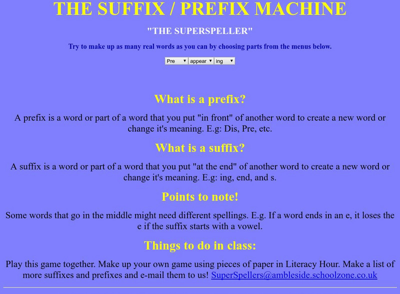 Site allows elementary students to create hundreds of different words by adding and replacing prefixes and suffixes. Also includes a definition and explanation of the prefix and suffix.