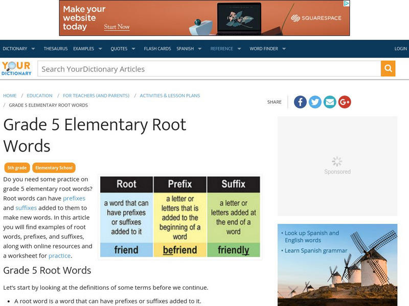 This article focuses on teaching root words to 5th graders. It includes an explanation of root words, prefixes and suffixes, and word families. It also provides a root words worksheet with answer key.