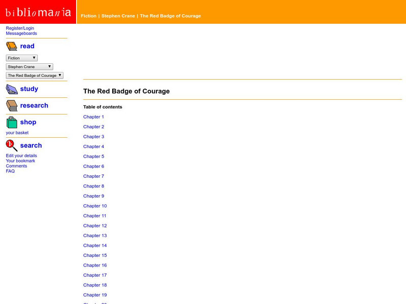At this website, read the full text of Stephen Crane's novel, "The Red Badge of Courage." Text is organized by chapter.