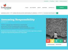 Young scholars examine the importance of responsibility. In this character education lesson plan, students participate in a group discussion to explore and define responsibility.