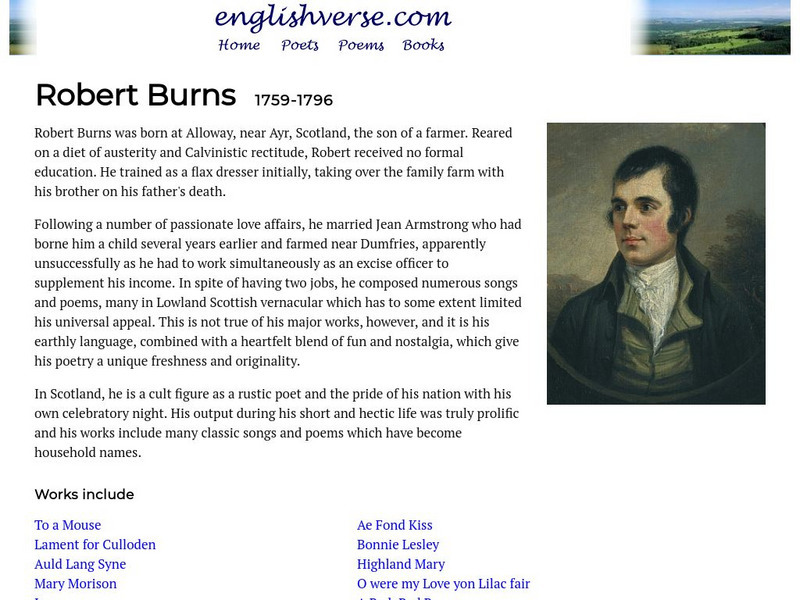 Read a brief biography, and the full text of quite a number of Burns' poems at this site. Includes some recommendations for books about Burns, as well.