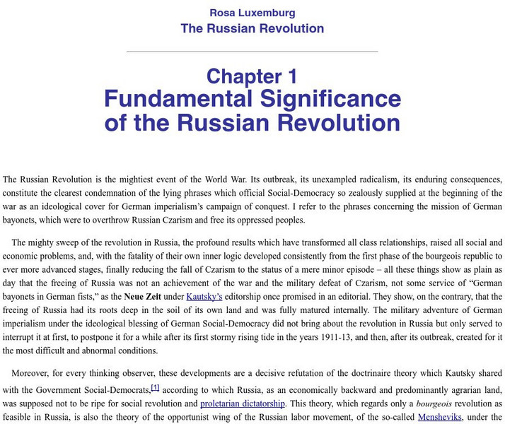 This site provides a work by Rosa Luxemburg that details the significance of the Russian Revolution and how it related to all people of Russia, especially the lower working class.