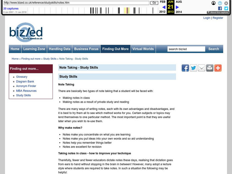 This webiste from Biz/ed discusses taking notes in class and taking notes from written sources. It lists some tips on how to improve your technique on taking notes in class, and lists five different methods and the...