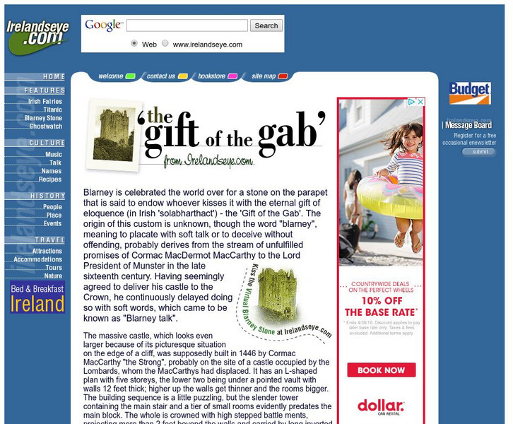 A brief description and history of the Blarney Stone, a castle in Ireland which according to legend will give one the "gift of gab" if they kiss it.