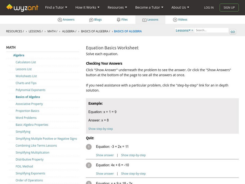 An inter-active quiz from WyzAnt of 20 simple equations for students to solve. The solutions are displayed after the students input their answers.