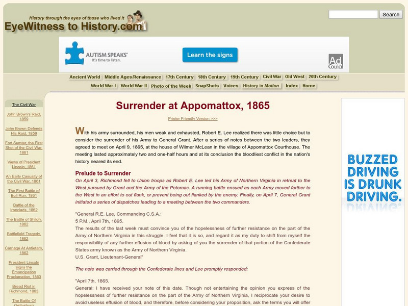 Part of the website of Appomattox Court House National Historical Park, this site details the surrender of Confederate forces at Appomattox in the Civil War. Includes The Gentleman's Agreement, terms of the surrender, and officers...