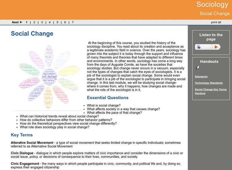 Learning module in Sociology on what leads to social change. Site offers theoretical perspectives and case scenarios. Instruction through informational text, video, and questions for review.