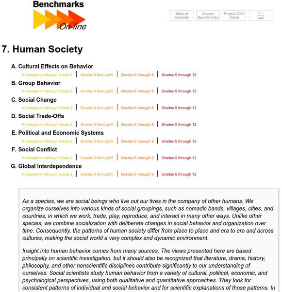 A wealth of information on topics such as, cultural effects on behavior, group behavior, social change, political and economic systems, social conflict,and global interdependence. Each topic is broken down in to benchmarks by age groups...