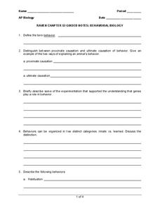 Ten questions about animal behaviors make up this AP biology worksheet. Learners explain behaviors such as instinct, reflexes, imprinting, dominance, and defending territory. Question #6 is in reference to a PowerPoint presentation that...