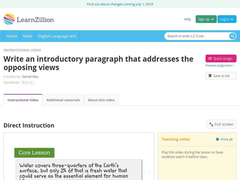Learn Zillion: Write an Introductory Paragraph That Addresses the Opposing Views
