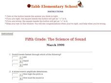 In this sound worksheet, students answer 17 questions about the science of sound. There are four answer choices for each question. This is an online interactive worksheet. Note: There is the name of a school printed on the page.