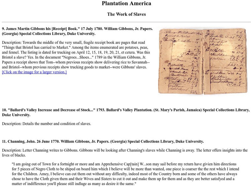 On this webpage, the primary text contains selected entries from letters and journals. It also describes slaves delivering rice to Savannah, slave numbers, their condition on a plantation, how slaves were used, and a map and a drawing of...