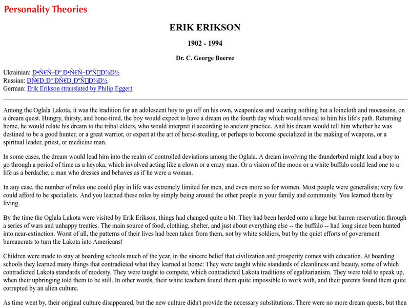 Excellent site for comprehensive knowledge on Erikson's personality theory with strong emphasis on his eight stages of development. Brief biography of Erikson and history of how theories were developed.