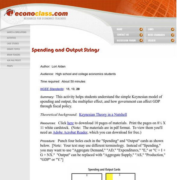 In this classroom activity, "output" cards and "spending" cards are placed on a string. As each increase or decrease, the economy faces more unemployment or inflation. A good visual device to study the relationships among output,...