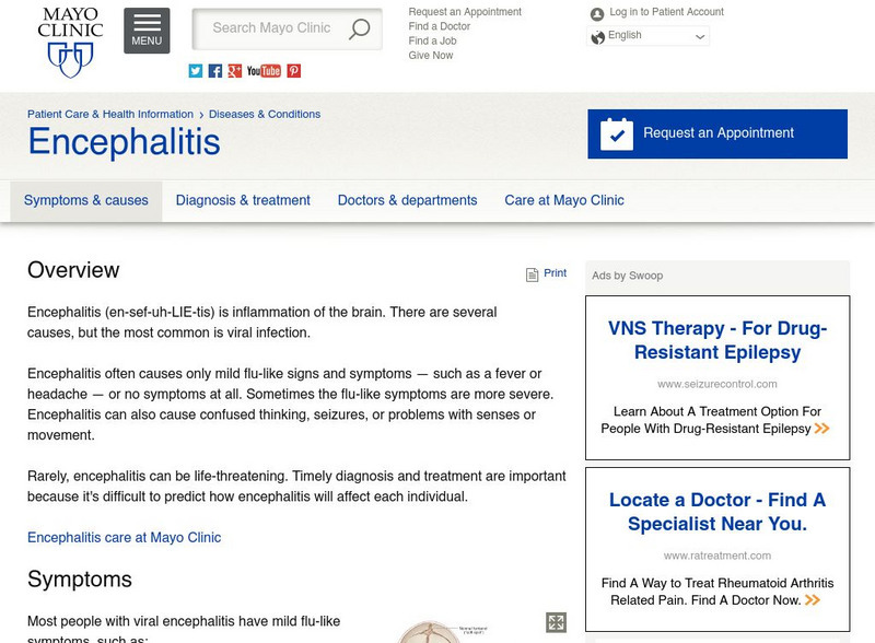 This site from the MayoClinic.com provides a great look at the acute inflammation of the brain caused by a viral infection known as encephalitis. Sections in the article include: signs and symptoms, causes, screening, treatment,...