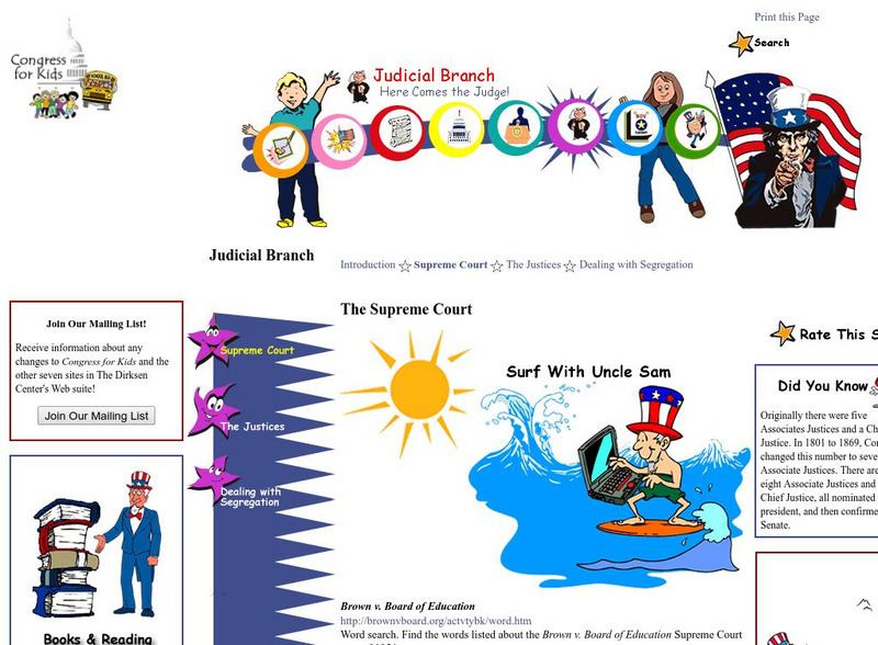 The Dirksen Center provides a page of excellent links to information about the Supreme Court including information on Brown v. Board of Education, the Constitution test, a dual court system, equal protection, supreme court judges, the...