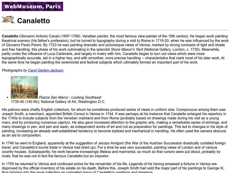 This ibiblio.org Web Museum site provides information about the life and artwork of Venetian painter, Giovanni Antonio Canal (1697-1768 CE). Contains mostly biographical info, with one example of his artwork, and a brief description.