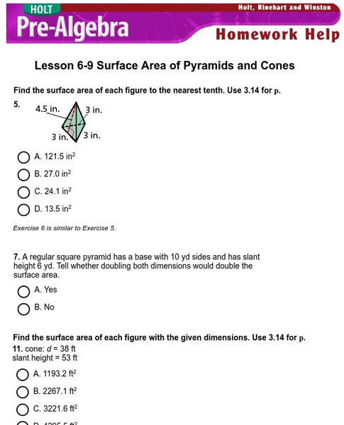 Holt, Rinehart and Winston: Homework Help Independent Practice: Surface Area of Pyramids and Cones