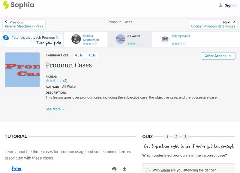 This lesson focuses on pronoun case including subjective, objective, and possessive case. It provides examples of each and also discusses personal pronouns, reflexive / intensive pronouns, and the use of Who and Whom. It offers links to...