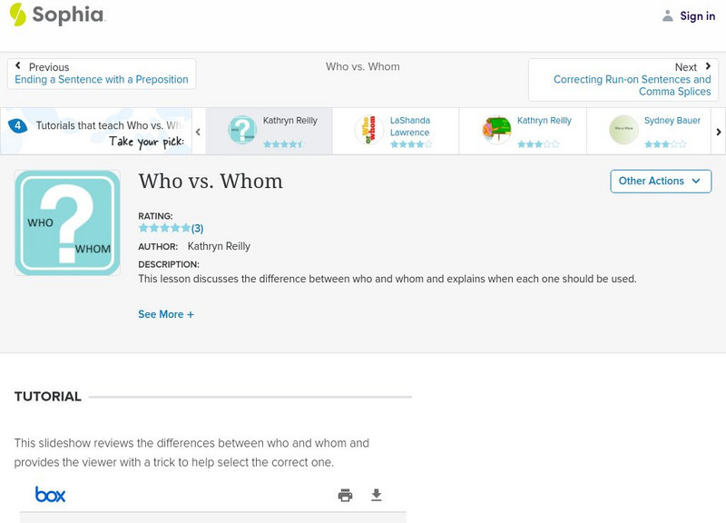 This lesson discusses the difference between who and whom and explains when each one should be used. This tutorial lesson shares a short slideshow with the lesson's content.