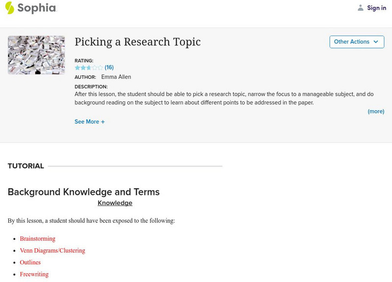This tutorial focuses on picking a research topic by brainstorming and freewriting about what interests you or what you want to learn more about and doing background reading to see what information is available for your possible topics....