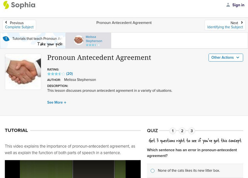 This video lesson focuses on pronoun and antecedent agreement including in number and in gender. It also provides rules for using indefinite pronouns, collective nouns, and compound nouns. [7:03]
