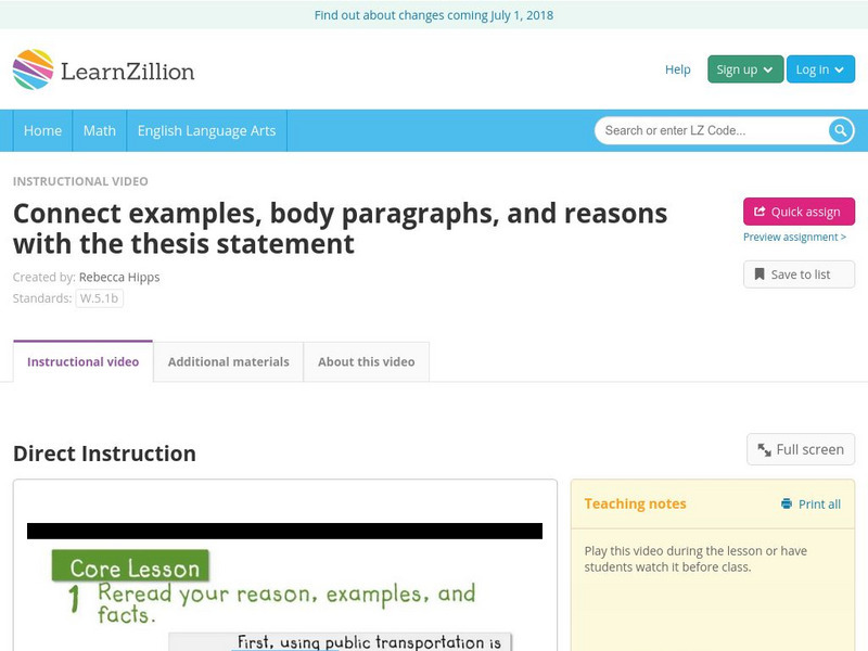 Learn Zillion: Connect Examples, Body Paragraphs, and Reasons With the Thesis