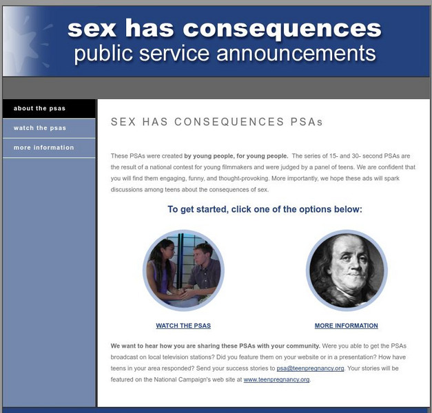 Various public service announcements from a contest offered by the National Campaign to Prevent Teen Pregnancy. You can see the PSAs and find more information about Teen Pregnancy facts.