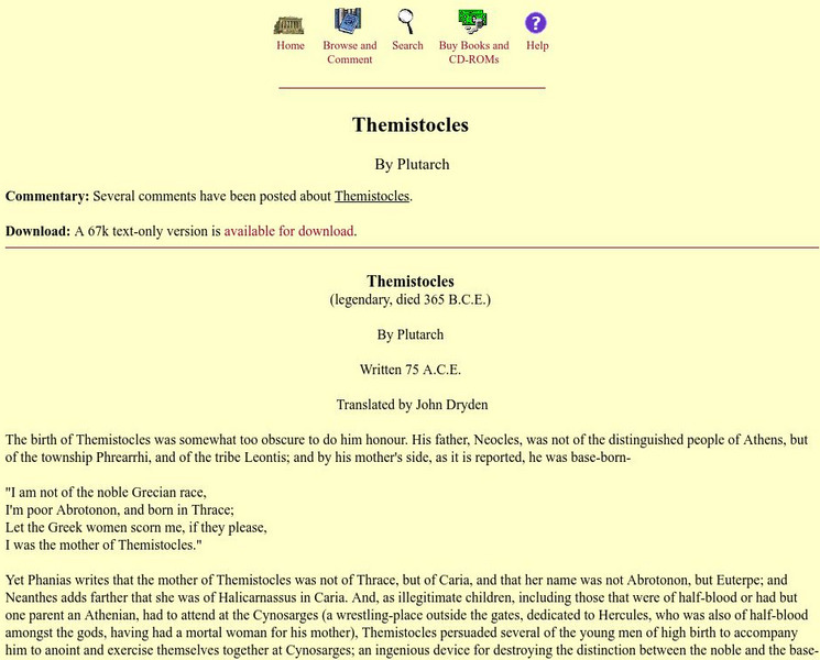 This site provides a translation of the biography of Themistocles, the famous Greek naval commander, by Plutarch, noted ancient historian.