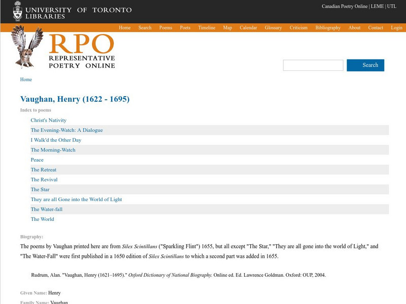 This site indexes a full-text of 11 of Henry Vaughan's poems. Also included is some biographical information.