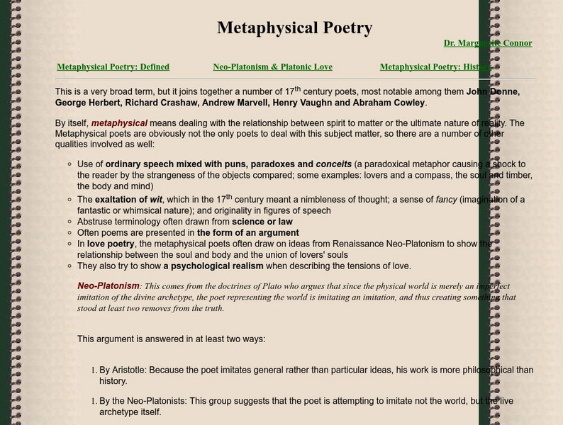 This article by Dr. Marguerite Connor focuses on metaphysical poetry and the metaphysical poets. It includes a definition, the characteristics, a discussion of metaphycial poets and poetry, Neo-Platonism, platonic love, and T.S. Eliot's...