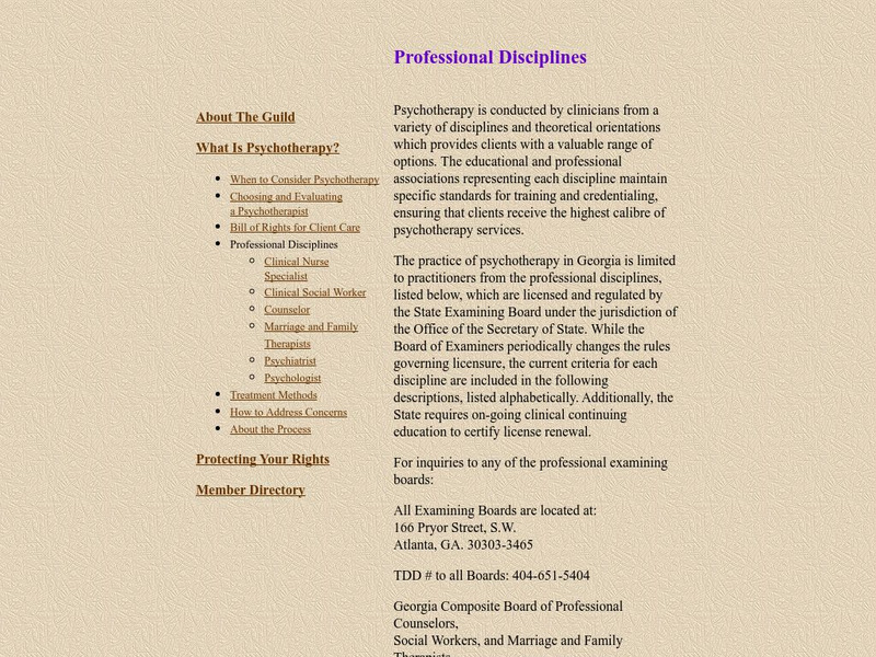 This site, which is provided for by the Psychotherapy Guild, lists and describes various types of professionals who practice psychotherapy.